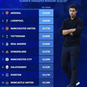 星空-夏窗净支出榜:阿森纳领衔英超8队无切尔西,皇马&加拉塔萨雷在列
